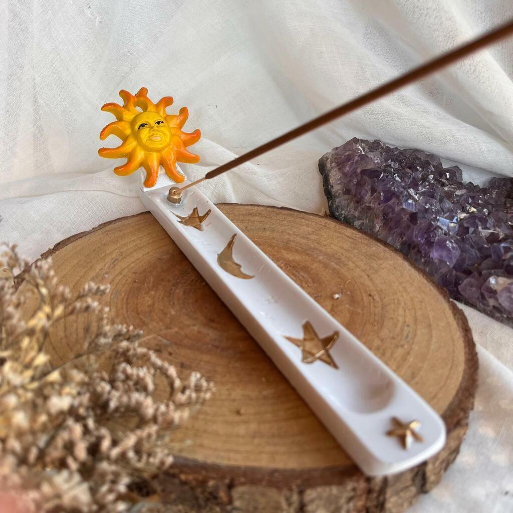 Incensário para varetas de Sol em resina.Dimensões Aproximadas: Comprimento 22cm e largura 3,5cm.