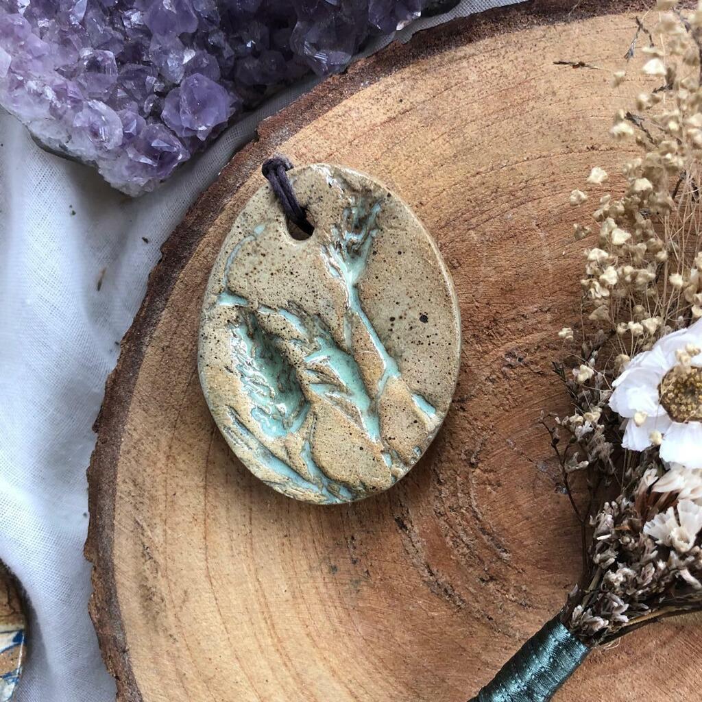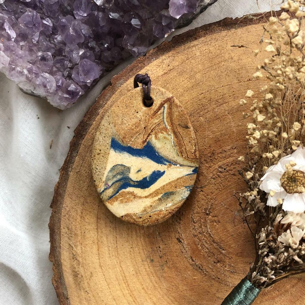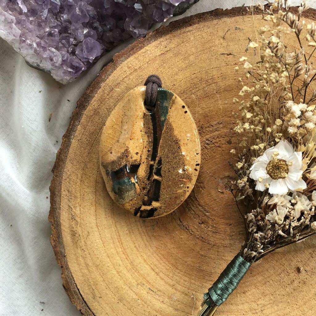 Pingente confeccionado em cerâmica com pintura esmaltada. Acompanha um cordão de algodão que pode ser utilizado como corrente.
