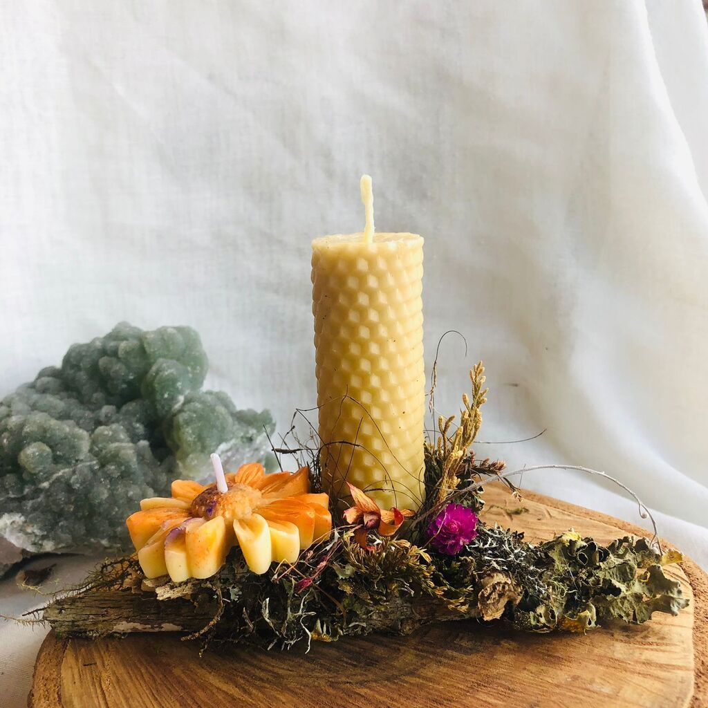 Arranjo de Natal feito com galhos , plantas e musgos naturais e vela feita de cera de abelha no centro e outra vela de cera de abelha em formato de flor ao lado.