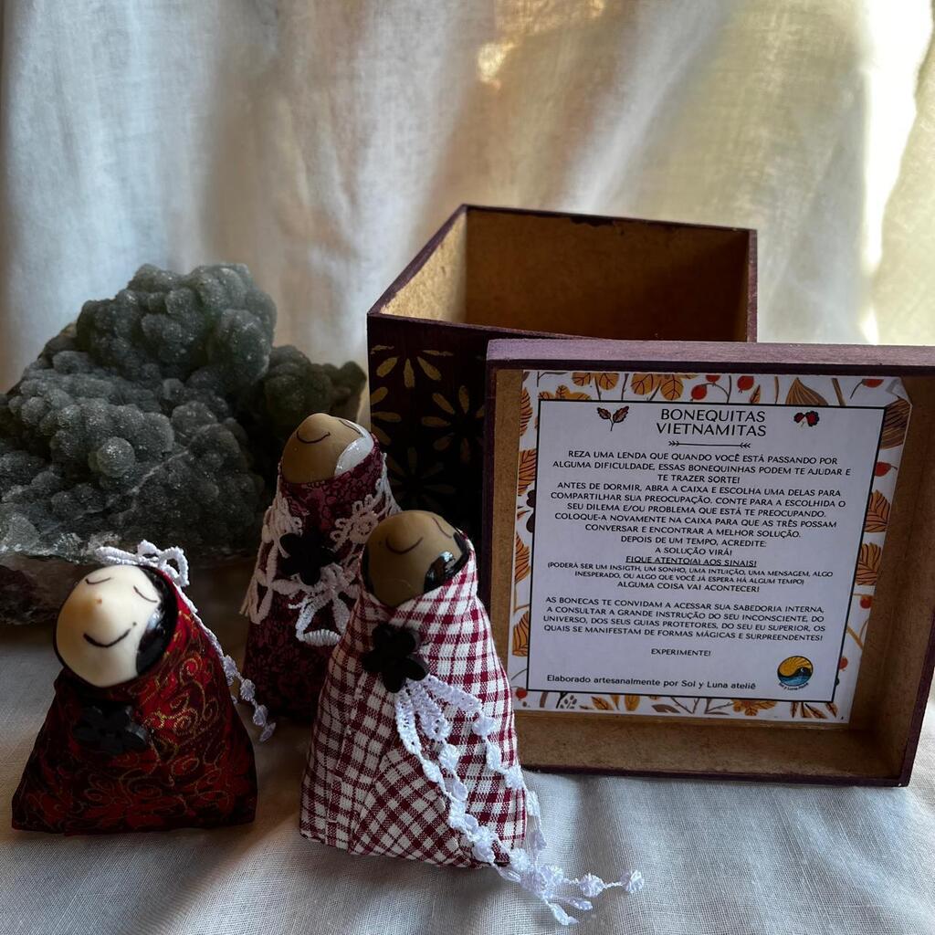 Antes de dormir, abra a caixa e escolha uma delas para partilhar sua preocupação. Conte para a escolhida o seu dilema e/ou problema que esta te preocupando. Coloque-a novamente na caixa para que as três possam conversar e encontrar a melhor solução. Depois de um tempo, acredite: a solução virá!