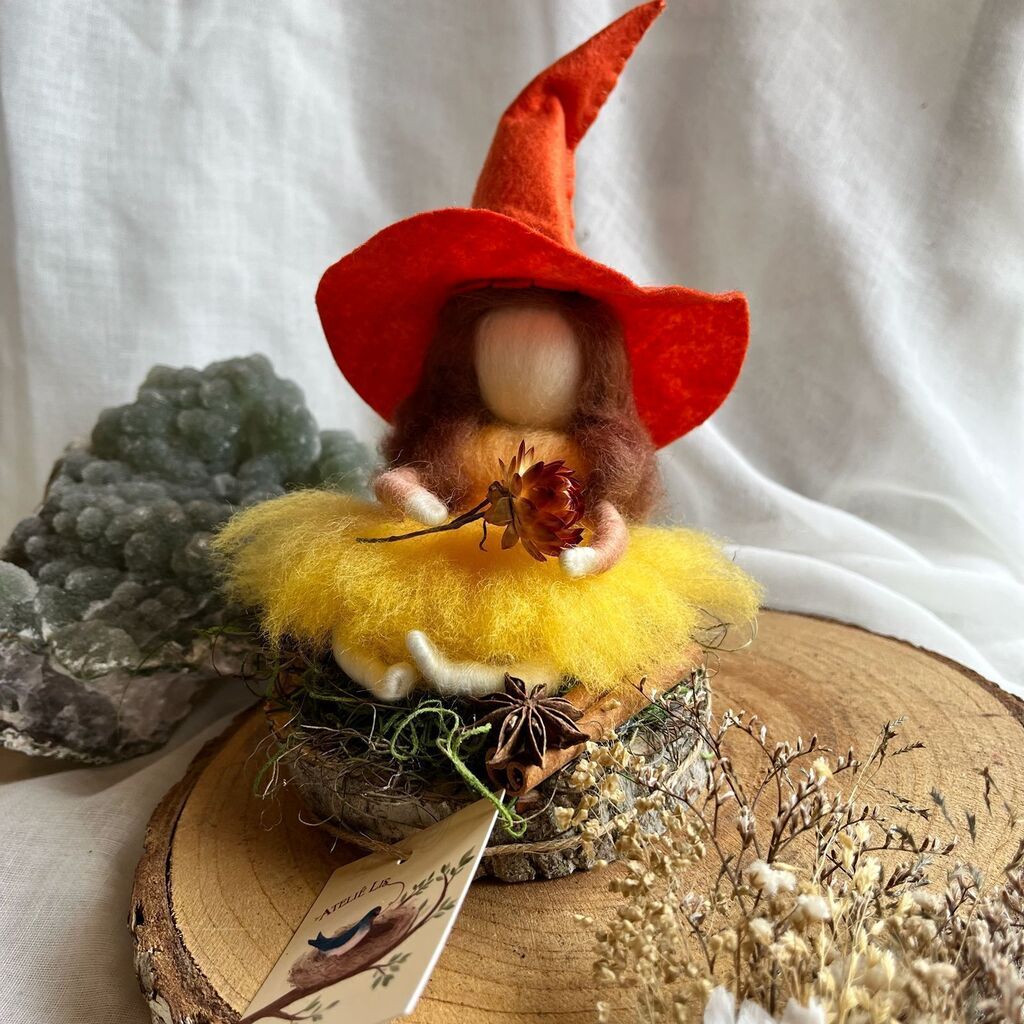 Bruxinha decorativa feita artesanalmente pela técnica de feltragem por Atelie Lis e tronco de madeira decorado.