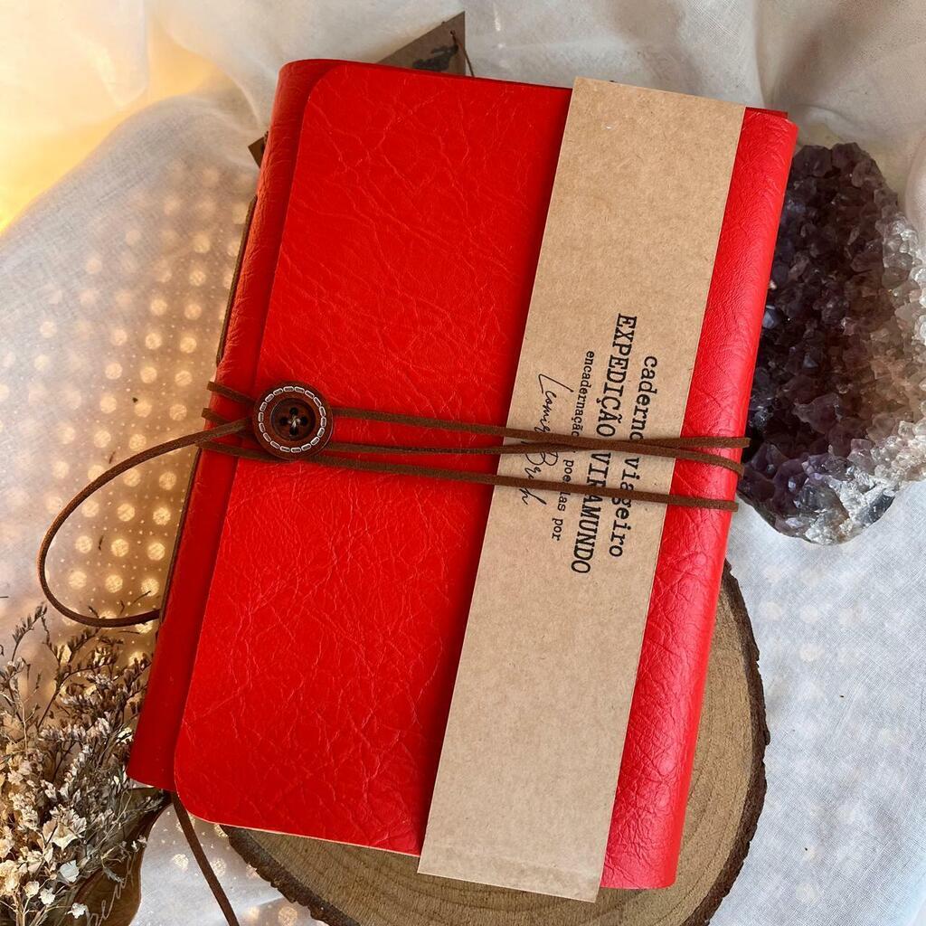 Encadernação em corvim (couro sintético, sem sofrimento animal), com revestimento interno em tecido impermeável, fechamento em couro sintético.