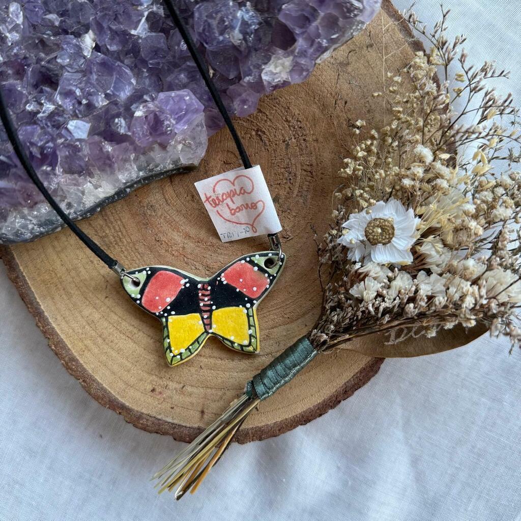 Colar com pingente de borboleta de cerâmica feita e pintada a mão com corrente de veludo, courino ou metal (não é possível trocar o colar).