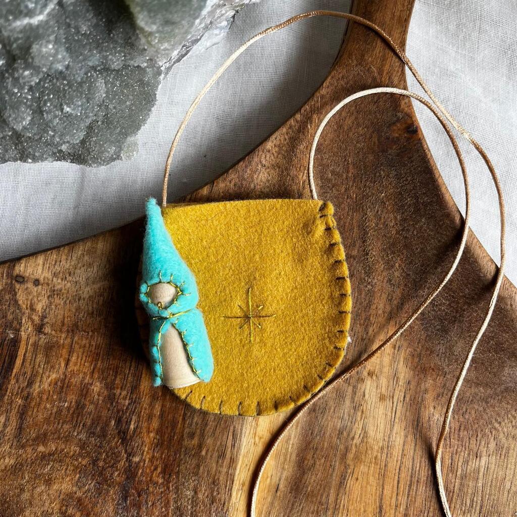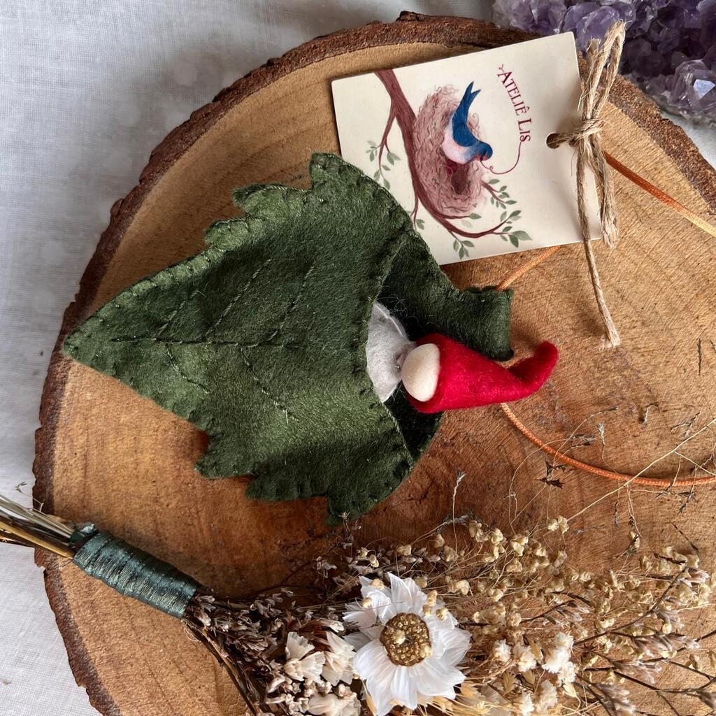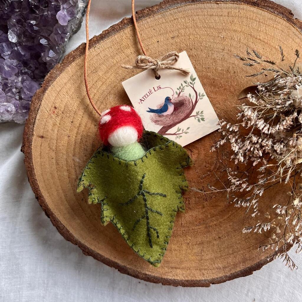 Colar com pingente em formato de folha com ser encantado feito artesanalmente pela técnica de feltragem.