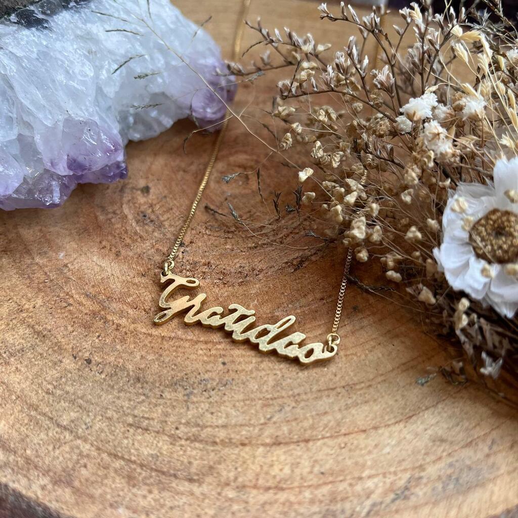 Colar com a palavra ''gratidão'' escrita em letra discursiva, em metal dourado.