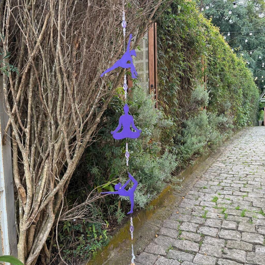 O fio de luz traz boas energias para o ambiente, irradiando luz e repelindo negatividades. Feito com diferentes posições do yoga, símbolos e um cristal facetado na ponta.