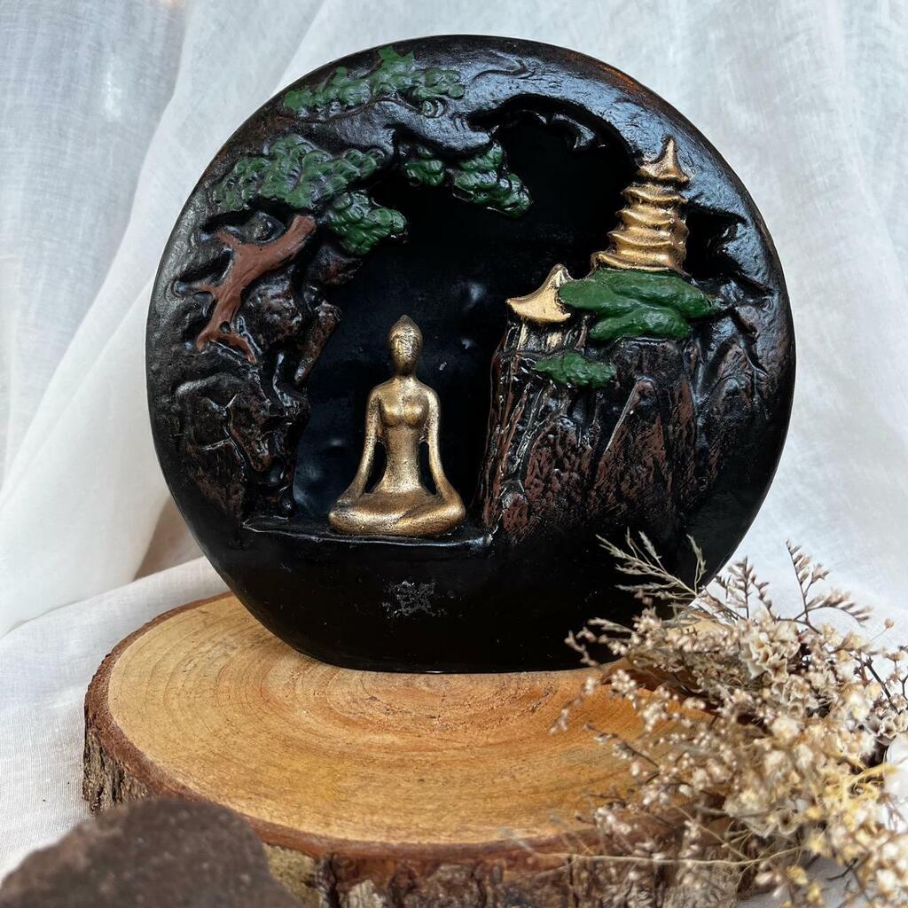 Uma peça decorativa e imponente em seu tamanho, produzida em resina, este incensário que cria o efeito de fumaça invertida ou cascata de fumaça e traz como inspiração um vale de meditação com árvores e elementos que remetem ao budismo e a prática da meditação.