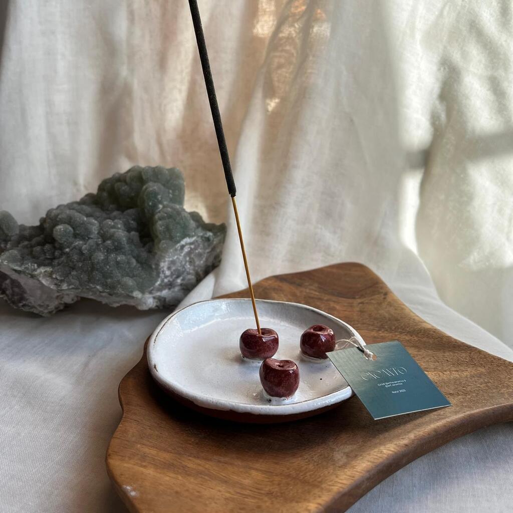 Incensário Redondo com detalhe em cereja (fruta) feita à mão por Encanto Cerâmica.