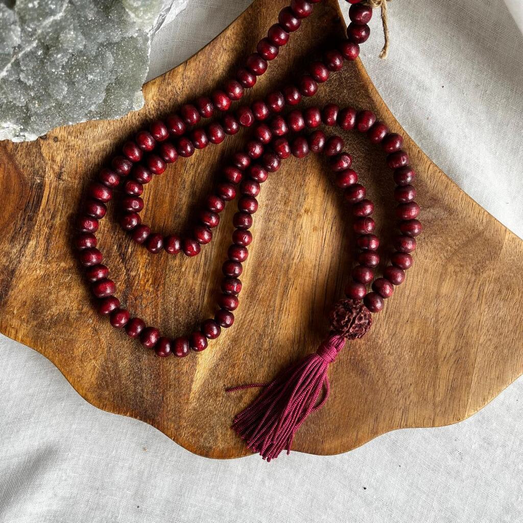 Feito com madeira, semente de rudraksha e tassel de seda poliester.