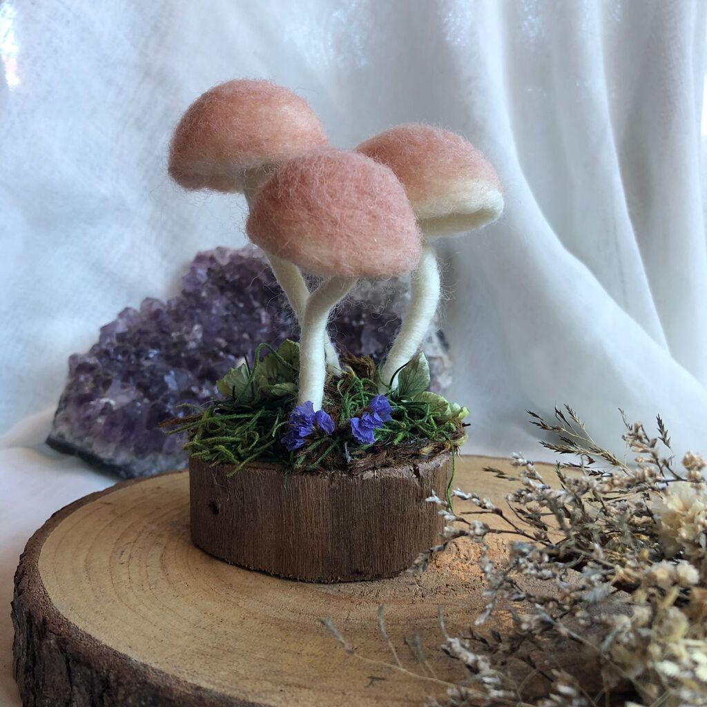 Cogumelos feitos artesanalmente pela técnica de feltragem.
